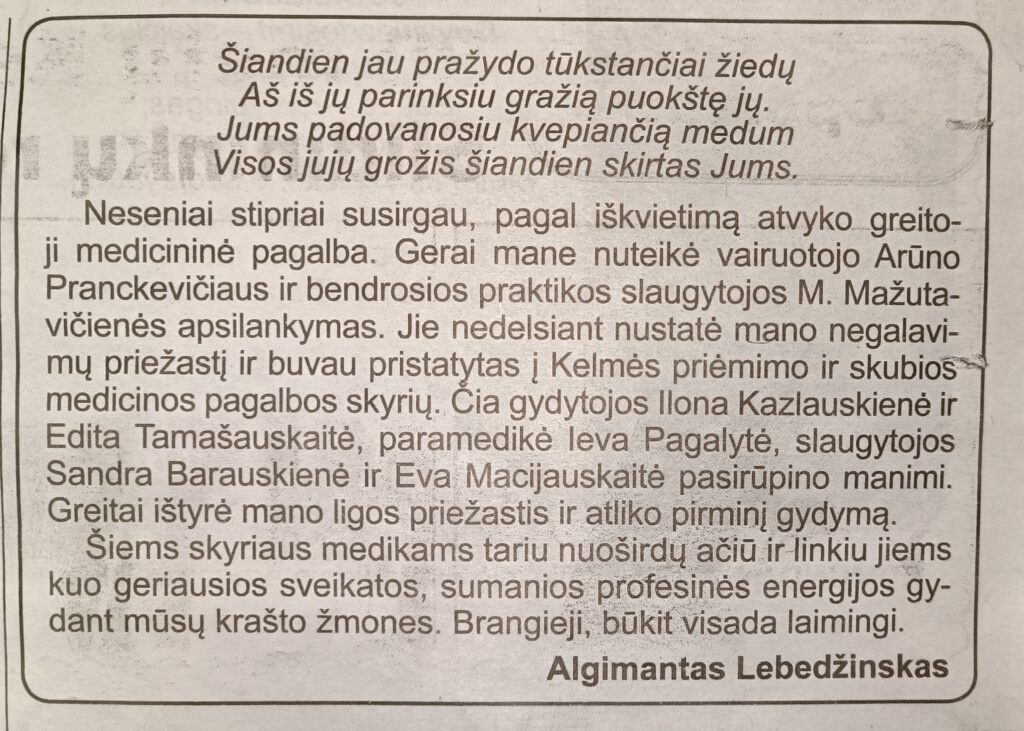 Dalijamės laikraštyje „Bičiulis“ publikuotu straipsniu, kuriame išreiškiama padėka mūsų įstaigos Priėmimo ir skubiosios medicinos pagalbos skyriaus darbuotojams.